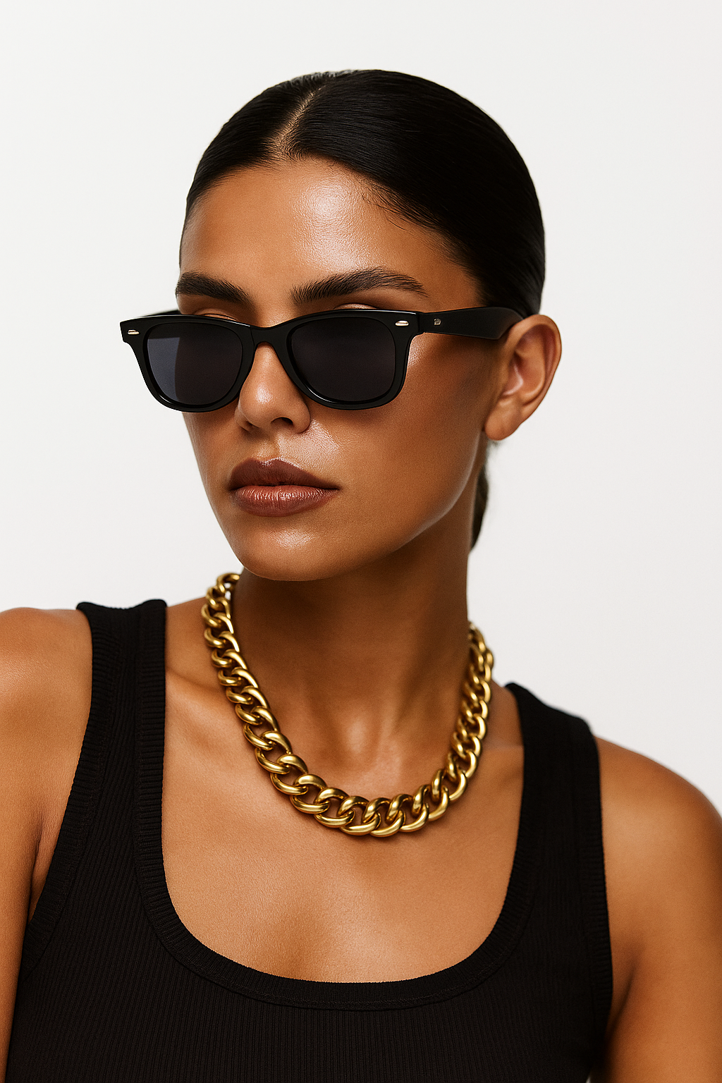 Keskin hatlı siyah çerçeve → minimalist & urban şıklık